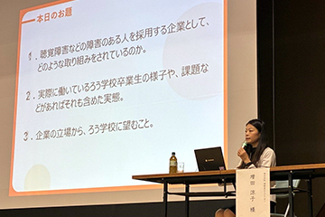 人事部長の増田が東京都ろう教育研究協議会からのご依頼を受け、都立ろう学校の教員の方々、およそ300人を前に登壇し、聴覚障害者雇用の現状と課題についての講演を行いました。聴覚障害のある社員を多数雇用する企業としての課題感やそれに対応するための取り組みなどを具体的な事例を交えてお話しするとともに、ろう学校に期待することとして、卒業後、社会で自立して働くために、学生時代に身につけておくべき力やスキルについても提言させていただきました。